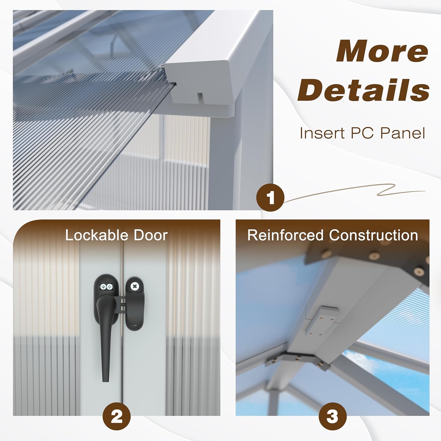 - Multi-Layer PC Panels – Constructed with multi-layered polycarbonate panels, this outdoor greenhouse offers excellent thermal insulation. The translucent panels block harmful UV rays while allowing up to 90% light transmission, giving plants the sunlight they need for strong, healthy growth.